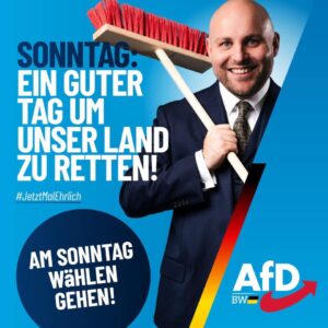 Die CDU wird ihren Wählern mit jeder Firmenpleite, jedem Messerstich dringender erklären müssen, warum sie für bequeme Posten und Pfründe in Grüner Geiselhaft verbleibt, anstatt mit der AfD zusammen die – rechnerisch mögliche – Rettung des Landes einzuleiten. Diese wird kommen, wenn nötig ohne euch! #Landtagswahl PS: Soeben sehe ich, dass Bernhard Pepperl aus dem AfD Kreisverband Mannheim im WK Mannheim Nord das (einzige) Direktmandat für die AfD holen konnte. Das ist ganz großartig, Gratulation!
